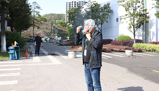 員工手捂口鼻低頭彎腰井然有序逃離火災(zāi)現(xiàn)場