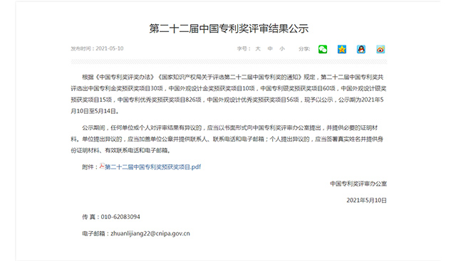 根據《中國專利獎評獎辦法》《國家知識產權局關于評選第二十二屆中國專利獎的通知》規定,第二十二屆中國專利獎共評選出中國專利金獎預獲獎項目30項,中國外觀設計金獎預獲獎項目10項,中國專利銀獎預獲獎項目60項,中國外觀設計銀獎預獲獎項目15項,中國專利優秀獎預獲獎項目826項,中國外觀設計優秀獎預獲獎項目56項。
